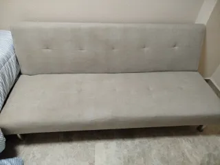 Sofá cama de tela con estructura metálica. - Diseño moderno y funcional. - Tapizado en tela de color beige y gris. - Patas metálicas resistentes.