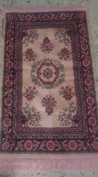 Elegante alfombra con un intrincado diseño floral y bordes decorativos. - Diseño central con motivos geométricos y florales. - Patrones florales repetidos en los bordes. - Flecos en los extremos para un acabado clásico. 2 alfombras Cada una 5 €