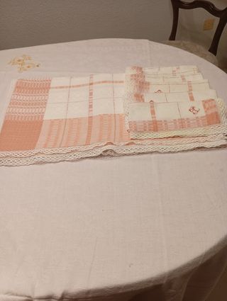 Mantel cuadrado 120x120 y 6 servilletas. De cuadros rosa y blanco. Bordes con puntilla Está marcada a punto de cruz con las iniciales "AC".