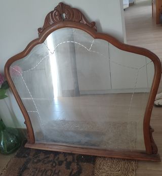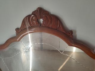 Precioso espejo antiguo de madera con detalles tallados. Es de color marrón y tiene un diseño curvado. - Marco de madera maciza. - Espejo con pátina del tiempo.