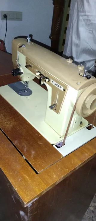 Máquina de coser clásica de la reconocida marca Singer. - Diseño vintage en tonos beige y marrón. - Construcción robusta con materiales duraderos.