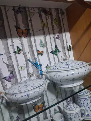 Elegante vajilla antigua de porcelana de la reconocida marca Vista Alegre. Un conjunto clásico con detalles dorados que aportará distinción a tu mesa. 9 tazas y 11 platillos 1 Lechera 1 azucarero 1 Cafetera 1 Sopera 3 Fuentes ovaladas 1 Salsera con plato 2 boles pequeños 21 platos llanos 11 platos soperos 12 platos de postre 12 platos de pan 1 fuente redonda(ensaladera) - Piezas con diseño de borde dorado. - Material: Porcelana de alta calidad.