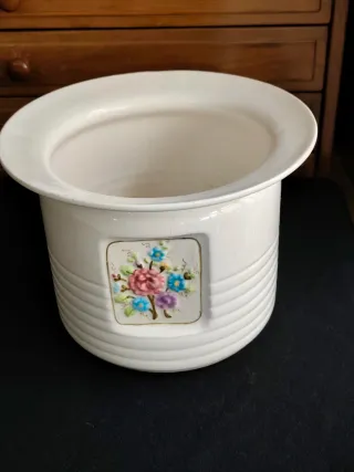 Bonito macetero antiguo de la marca Pedralba, con un diseño floral pintado a mano. - Decoración de flores en relieve. - Acabado blanco con detalles multicolores. - Pieza de cerámica con un toque vintage.