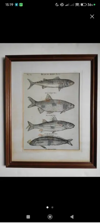 Cuadro con marco madera marrón y lámina peces estilo vintage. Con cristal. paspartú con señales del tiempo, ver fotos ! Medida Exterior: 53,5 x 43,5 Interior 48 x 28 cm Ideal para casa con decoración vintage retro o industrial.