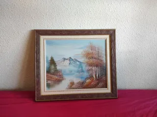 Precioso cuadro decorativo con un paisaje pintado. - Marco de madera con detalles. - Pintados a mano - Representación de montañas y lago.