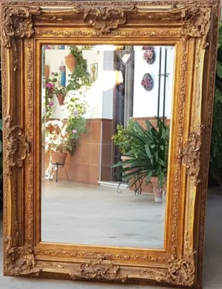 Elegante espejo antiguo con un marco ricamente tallado y acabado dorado. Añade un toque de distinción a cualquier estancia. - Marco con detalles ornamentales. - Diseño clásico y atemporal.