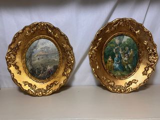 Pareja de cuadros ovalados dorados – escenas campe