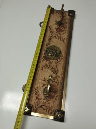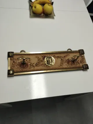 Elegante perchero de estilo Luis XV, con un diseño inspirado en la época. - Acabado en tonos beige y dorado. - Marco metálico con detalles ornamentales. - Panel central con tapicería floral. - Dos ganchos para colgar. - Adorno central con relieve.