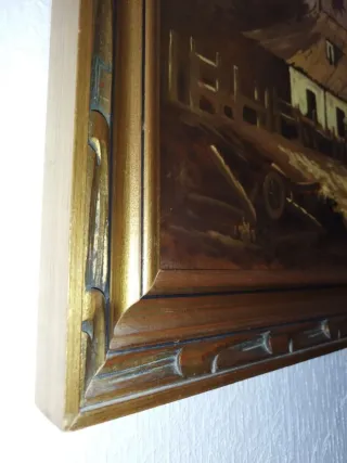 Precioso cuadro con un paisaje rural antiguo, enmarcado en madera. - Tonos marrones y dorados predominantes. - Marco de madera con detalles. Bajo finde de terciopelo. Medidas en las fotos. #cuadro, #vintage, #antique