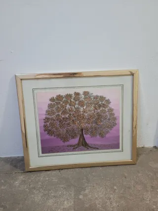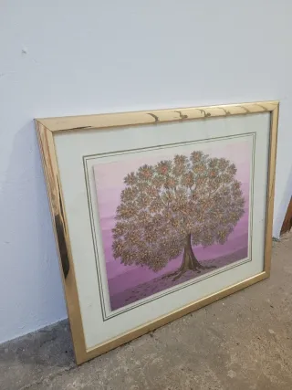 Conjunto de dos láminas decorativas con un árbol estilizado. - Marco con acabado dorado. - Fondo degradado en tonos morados. Tamaño 43x51cm