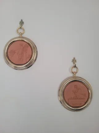 Precio unidad.Conjunto de dos cuadros camafeos decorativos con detalles en relieve de figuras de época en terracota y marcos dorados con anillas colgantes tipo camafeo..Precio de la pareja 30 Unidad 15 - Elaborados en terracota. - Marcos metálicos dorados. - Diseño clásico con figuras. - Listos para colgar.