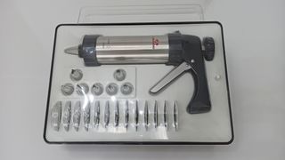 Pistola repostería con accesorios marca Lacor. Contiene 7 boquillas distintas y 13 discos distintos para galletas/pastas. Capacidad: 250ml. Acero inoxidable 18/10. Con práctico estuche para guardar todo en orden. La última foto es de catalogo. Está en su embalaje original plastificado.