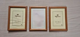 Conjunto de tres marcos para fotos de madera de la marca Hofmann. Precio por el lote. También para enmarcar láminas o recuerdos. Se pueden poner sobremesa o colgados en pared. - Medidas: 13 x 18 cm (5 x 7). - Color madera natural.