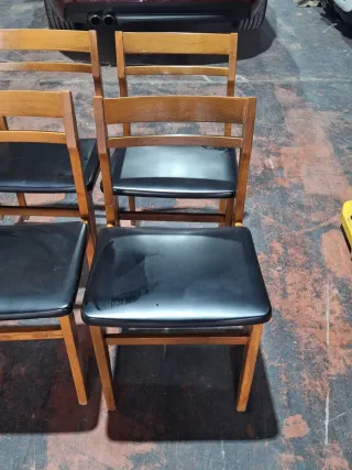 Se vende conjunto de seis sillas de comedor de la marca Gascón. Su diseño combina la calidez de la madera con la elegancia de la piel sintética. - Estructura de madera. - Asiento y respaldo en piel sintética negra.