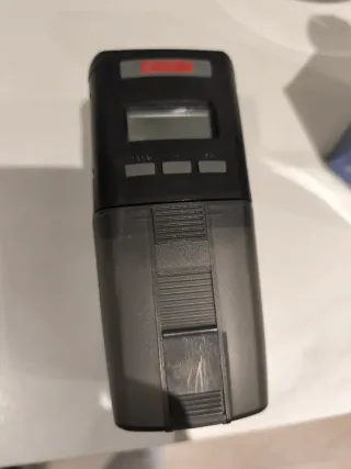 Dispensador automático de comida para acuarios de la marca Eheim. Su diseño es moderno y funcional. - Color negro y gris translúcido. - Pantalla digital. - Botones de control. - Compartimento para comida.