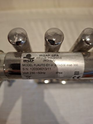 Calentador de toallas de la marca IRSAP, con un diseño moderno y elegante. - Acabado en metal pulido. - Múltiples barras para colgar toallas. - Incluye control digital para ajustar la temperatura. - Se instaló pero no usado.