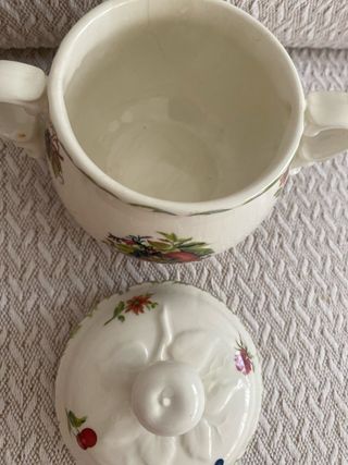 Elegante azucarero de la marca San Claudio, con un diseño delicado de flores y frutas. - Pieza de porcelana con detalles pintados a mano. - Asa y tapa a juego con un diseño clásico. - Aporta un toque de color y estilo a tu mesa. No hago envio