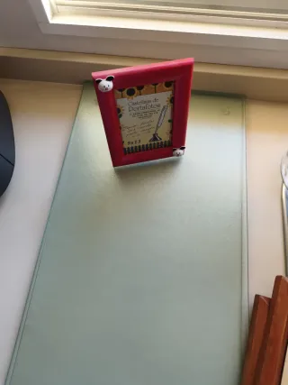 Marco de pared con acabado liso. - Tamaño A4 (21 x 30 cm). - Diseño moderno con borde fino. No estoy segura del material. Creo que es plástico Tiene una esquina dañada (ver foto). El resto está en buen estado