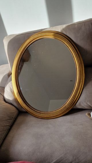 Elegante espejo ovalado con un diseño que evoca el estilo vintage. Su marco dorado añade un toque de distinción. - Marco con detalles ornamentales. - Forma ovalada de 70cm de alto por 60cm de ancho - Marco de madera dorada que puede pintarse en cualquier color decorativo