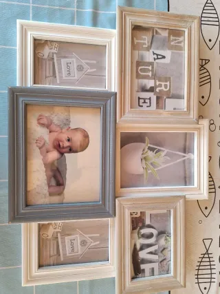 Conjunto de marcos de fotos con un diseño rústico y encantador. - Marcos de madera con acabado envejecido. - Diseños variados con motivos de Love y Nature. - Incluye un marco con foto de bebé.