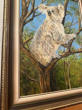 Precioso cuadro pintado a mano de un koala en su hábitat natural. La obra está enmarcada en madera. - Pintura al óleo. - Firmado y fechado en 1983. - 43x33 medidas