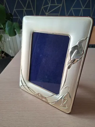 Elegante marco de fotos con detalles florales. Contraste ampliado en una de las fotos. Pequeño defecto en un borde (se ve en la última foto). - Para foto de 13×18 - Acabado en plata. - Marco interior de madera. - Medidas: 22 × 26'5