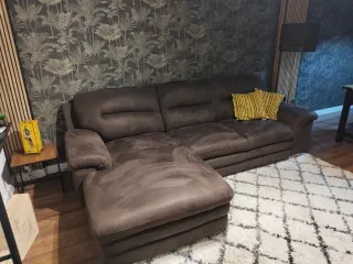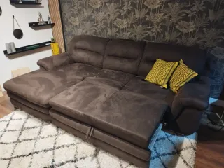 Sofá cama con chaise longue en color marrón oscuro. Es un mueble versátil y cómodo para tu salón. - Tapicería de tela y ante. - Diseño moderno y funcional.