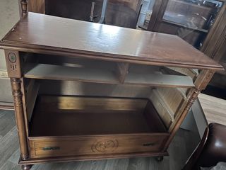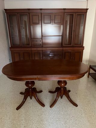 Mueble de salón estilo bodega, fabricado en madera. - Diseño clásico y elegante. - Amplio espacio de almacenamiento con puertas y cajones. - Acabado en madera oscura. Incluye armario, mesa grande extensible, 6 sillas, mesa pequeña. El comprador lo baja de un primer piso. Precio a negociar!!!!