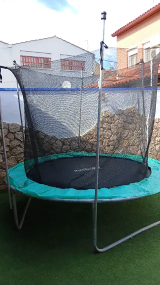 Cama elástica para exteriores con red de seguridad. - Estructura metálica. - Red de protección. Para cambiar - Cojín protector verde. Para cambiar Medidas 2.50 Hay tienda de accesorios por Amazon Para la Red y el colchón protector