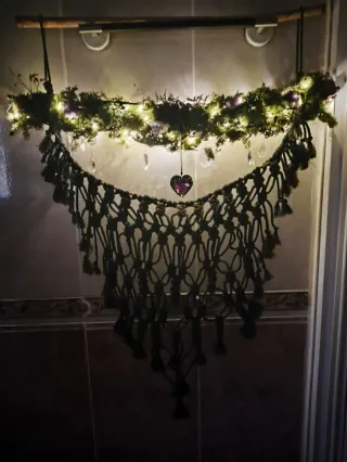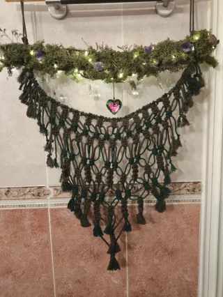 Precioso tapiz de macramé hecho a mano, con un diseño único que combina hilos en tonos marrón y verde. Cuelga un encantador corazón de cristal y está adornado con amatistas y cristales. - Elaborado con hilos de tela. - Incorpora piedras semipreciosas (amatistas). - Base de madera. - Adornado con cristales colgantes. Interesados ponerse en contacto para personalizar, menos trabajo menor precio.