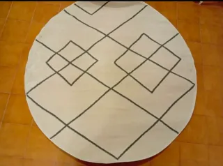 Alfombra redonda con un diseño geométrico moderno. - Diámetro de 160 cm. - Patrón de rombos y líneas en contraste. Nueva a estrenar, sin uso.