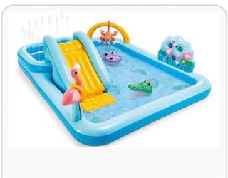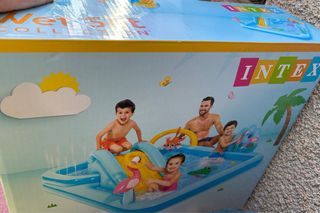 Divertida piscina inflable Intex para disfrutar en familia. Incluye varios accesorios para maximizar la diversión. - Diseño con tobogán y juegos de agua. - Figuras inflables de animales. - Rociador de agua integrado.