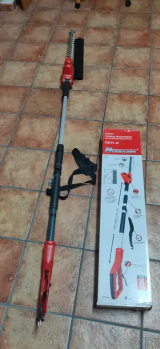 Cortasetos eléctrico telescópico de la marca Hurricane. - Mango extensible para mayor alcance. - Cuchillas de corte. - Correa de sujeción. - Incluye protector de cuchillas.