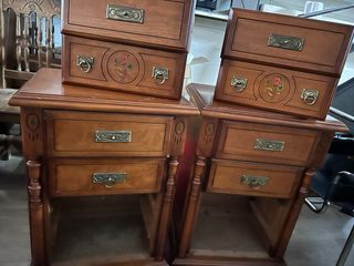 Conjunto de dos mesitas de noche de roble puro. Cada mesita cuenta con tres cajones y un diseño clásico. - Tiradores metálicos con diseño. - Detalles decorativos florales en el cajón central. - Patas torneadas.