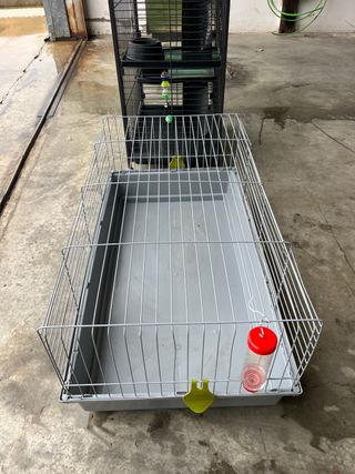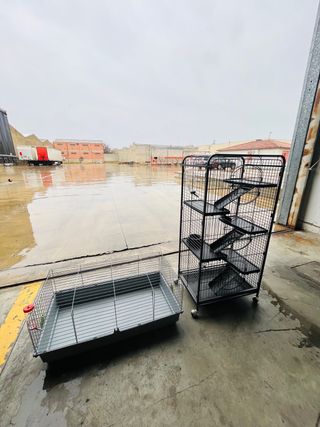Se venden dos jaulas para mascotas, una de color negro y otra gris. Ambas son ideales para ofrecer un espacio seguro y cómodo a tus animales. - Jaula negra con varios niveles y rampas. - Jaula gris con base amplia y bebedero.