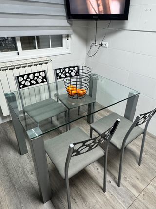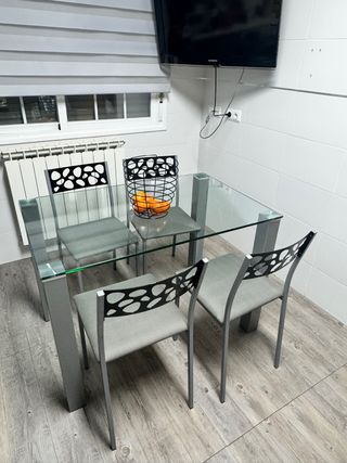 Mesa de cristal y 4 sillas grises