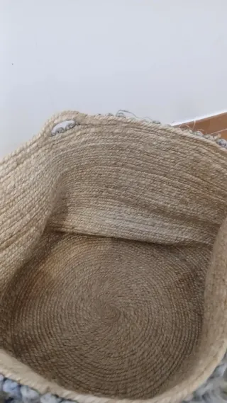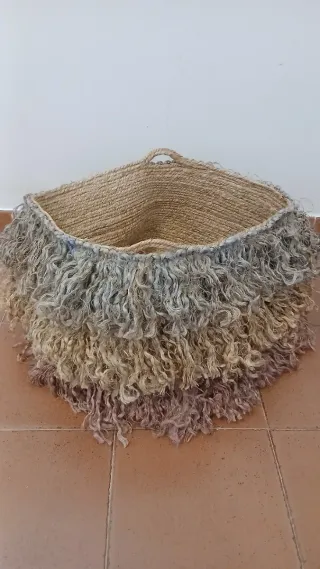 Cesta de estilo bohemio sin usar. - Elaborada con fibras de yute y detalles de lana. - Tonos naturales con rosa y verde apagados. - Diseño con flecos decorativos. - Diámetro 50 cm, alto 36 cm