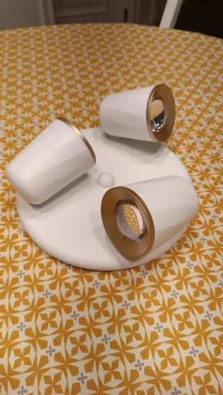 Lámpara de techo con un diseño moderno y elegante, perfecta para iluminar cualquier estancia. - Base circular en acabado blanco. - Tres focos orientables con detalles en dorado. - Diseño contemporáneo.