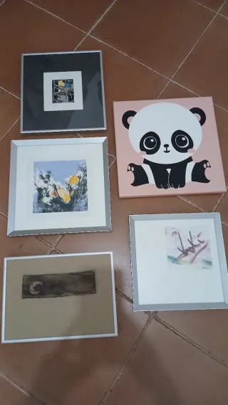 Cuadros variados, cada uno 5€, los cinco juntos 20€ - Marco de metal plateado. - Diseños variados: abstracto, floral y un simpático panda.