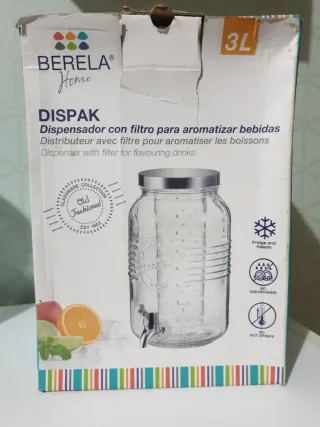 Dispensador de cristal de la marca Berela Home, con capacidad de 3 litros. Ideal para bebidas. - Con filtro para aromatizar bebidas. - Apto para frigorífico y congelador. - No apto para lavavajillas. - No apto para bebidas calientes. - Nunca se utilizó