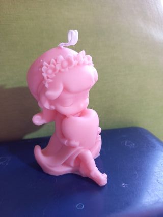 Encantadora vela con forma de niña, perfecta para eventos especiales o como detalle decorativo. Su diseño delicado la hace única. - Color rosa suave. - Figura con corona de flores. - Sosteniendo un corazón. Precio según modelo.