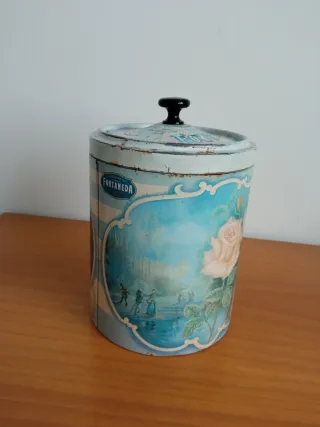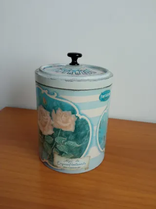 Bonita galletera antigua de la marca Fontaneda. - Diseño vintage con flores y detalles en azul. - Tapa con asa negra. - Ideal para coleccionistas o decoración. Con evidentes signos del paso del tiempo Altura 20 centímetros sin contar el pomo de la tapa Diámetro 15 cm