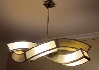 Elegante lámpara de techo con un diseño moderno y curvo que aporta un toque sofisticado a cualquier espacio. Su estructura metálica le confiere durabilidad y un acabado contemporáneo. - Diseño curvo y dinámico. - Acabado metálico cromado de alta calidad. Tiene bombillas fundidas,cuestión de cambiarlas. -Más modelos en mi perfil.