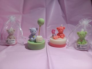 Conjunto de velas de soja artesanales, perfectas para dar un toque especial a cualquier evento. - Diseño de osito. - Base en forma de pastel. - Detalles decorativos como globos y corazones.