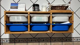 Mueble de madera maciza de pino con 6 bandejas extraíbles (3 blancas y 3 azules). Ideal para cocina, despensa, manualidades, juguetes o almacenaje en general. Muy resistente y en buen estado. Se vende tal como se ve en las fotos. Medidas: 90x30x20