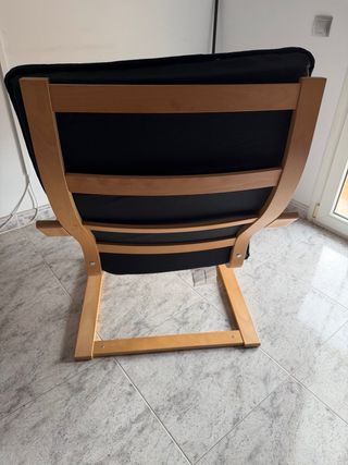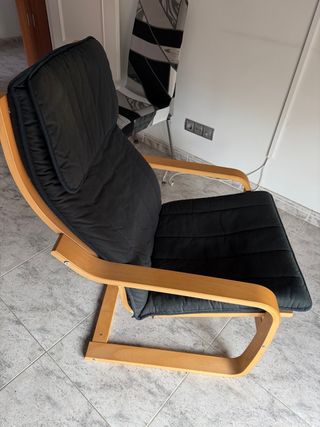 Vendo sillón IKEA modelo POÄNG con cojín original negro. En muy buen estado, cómodo y estable. Hogar sin humo y sin mascotas. Estructura de madera laminada en perfecto estado, sin holguras ni daños