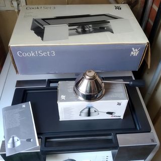 Parilla portatil WMF con fogon de gas rellenable mediante envase para rellenar mecheros a estrenar en su caja original. Fabricada de acero inoxidable y de alta resistencia. Vendo por no usar. Nueva costaba 180€. Valida para hacer a la plancha carnes, pescados, verduras...o para mantener la comida caliente. Se puede llevar y usar en cualquier parte sin necesidad de electricidad. Para enviar o recoger.