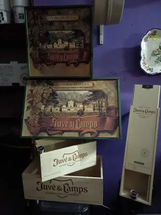 Cajas de madera de botellas de cava Juvé & Camps. 1 Caja grande pintura 35€ 1 Caja pequeña pintura 25€ 1 Caja Magnum 15€ 16x16x52 23 Caja grande sin tapa 5€ud 1 Caja pequeña sin tapa 5€ 2 Tapón cierre mecánico botella 6€ud