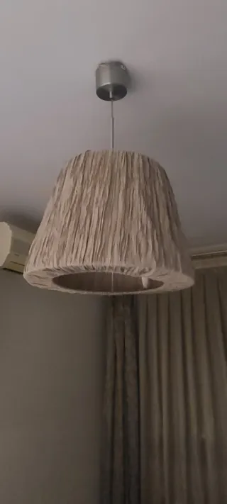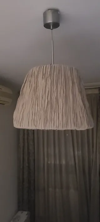 Lámpara colgante con un diseño moderno y elegante. - Pantalla de tela con textura. - Base y varilla de metal.