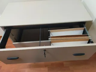 Mueble archivador con dos cajones, ideal para organizar documentos y carpetas colgantes. Su diseño es funcional y se adapta a cualquier espacio de oficina o estudio. - Dos cajones amplios. - Cerradura central con llave incluida.